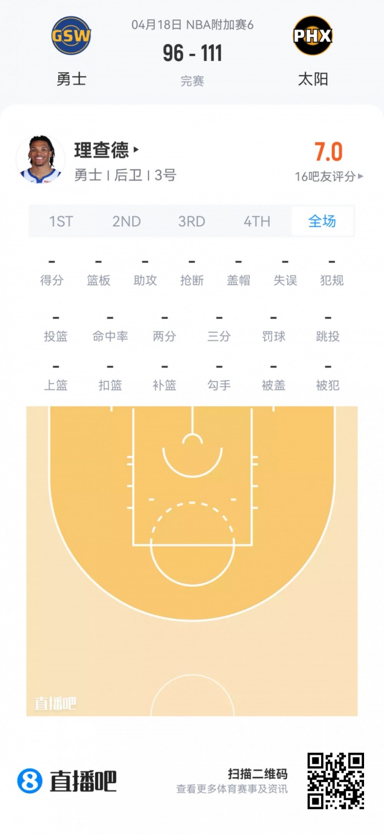 勇士次轮56号秀威尔·理查德 登场1.1分钟